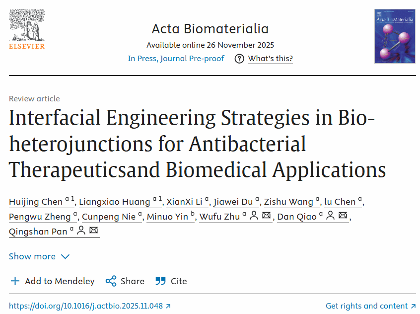 近日,我校药物分子设计与评价江西省重点实验室、药学院团队在国际医学权威期刊《Acta Biomaterialia》(中科院一区TOP,IF=9.6)上发表题为“Interfacial Engineering Strategies in Bio-heterojunctions for Antibacterial Therapeuticsand Biomedical Applications”的最新成果。该综述论文第一作者为江西科技师范大学药学院2023级硕士研究生陈慧静,通讯作者为朱五福教授、潘青山副教授、乔丹博士。