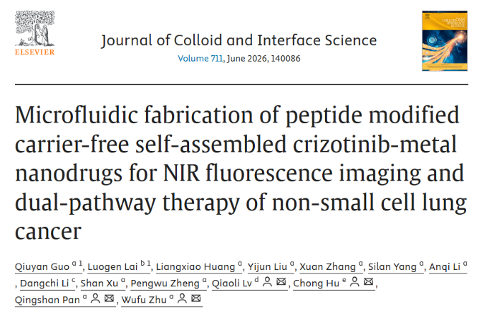 近日,我校药学院、药物分子设计与评价省重点实验室郑鹏武课题组潘青山、朱五福博士在化学领域国际期刊《Journal of Colloid and Interface Science》(中 国科学院一区TOP,IF=9.7)上发表题为“Microfluidic fabrication of peptide modified carrier-free self-assembled crizotinib-metal nanodrugs for NIR fluorescence imaging and dual-pathway therapy of non-small cell lung cancer”的最新研究成果。该文第一作者为我校药学院2022级硕士研究生郭秋燕,通讯作者为朱五福教授、潘青山副教授、胡冲副教授。