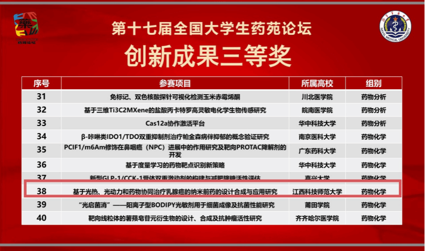 项目《基于光热、光动力和药物协同治疗乳腺癌的纳米前药的设计合成与应用研究》由周莹怡等同学完成,乔丹、张瑾征老师指导。该研究融合三重治疗机制,为乳腺癌精准治疗提供新思路。项目《金属价态转变策略设计的双金属纳米酶热敏水凝胶用于深部组织感染治疗》由李娴晰、潘杰仪、李仁熙等同学完成,聂存鹏、潘青山、徐珊老师指导。该研究成果有望应用于皮下脓肿、细菌性角膜溃疡等难治性感染治疗。两项成果充分展现了我校药学专业学生扎实的科研素养与创新能力,彰显了团队面向临床需求、服务健康中国的责任担当。