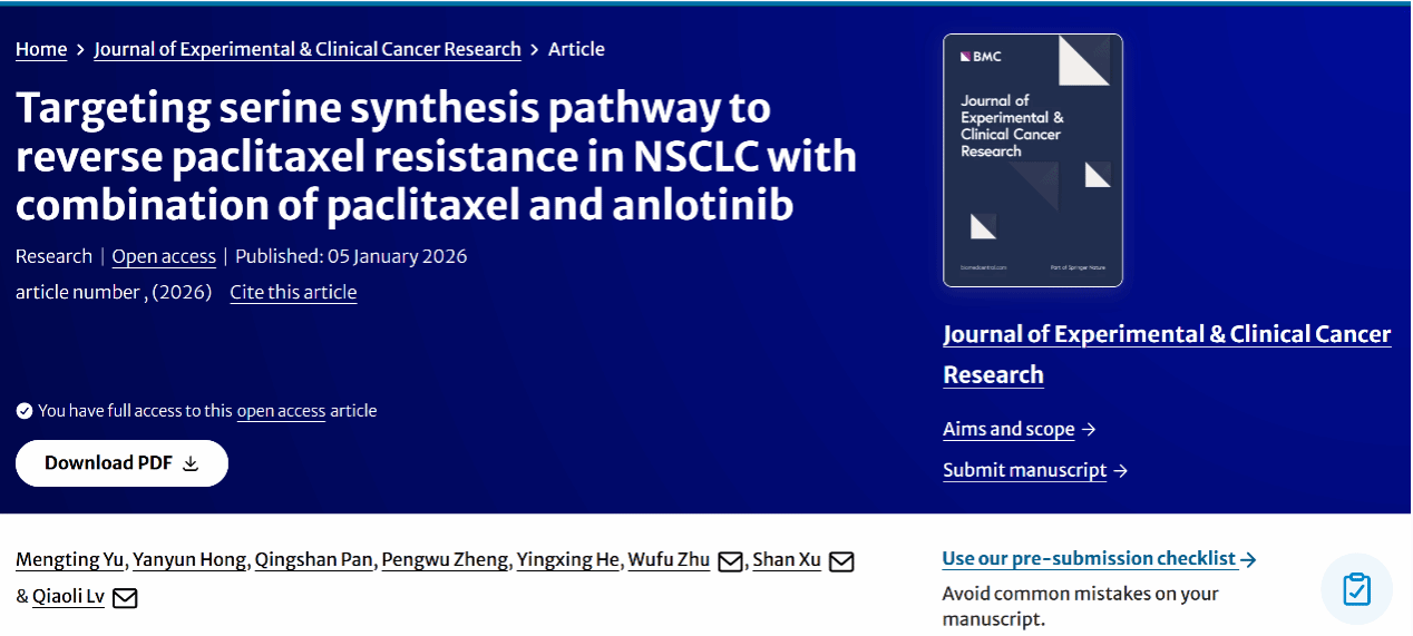 近日,我校药学院、药物分子设计与评价江西省重点实验室郑鹏武教授团队徐珊教授在国际医学权威期刊《Journal of Experimental & Clinical Cancer Research》(中国科学院医学-肿瘤学一区TOP期刊,IF= 12.8)上发表了题为“Targeting serine synthesis pathway to reverse paclitaxel resistance in NSCLC with combination of paclitaxel and anlotinib”的研究论文。论文第一作者为药学院2022级硕士研究生余梦婷,通讯作者为徐珊教授与江西省肿瘤医院吕巧莉教授。